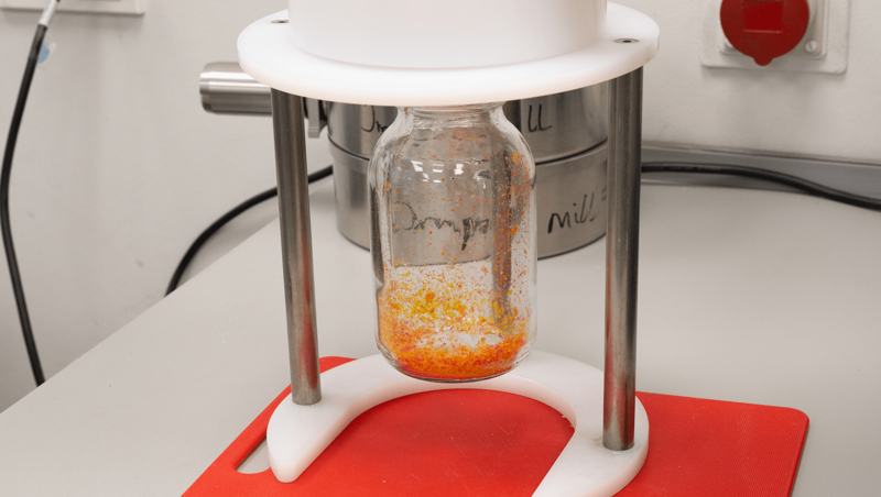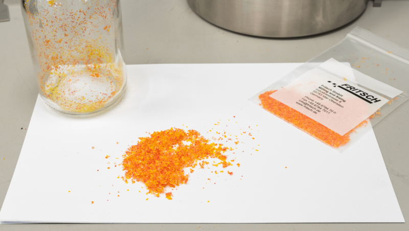 The next step was to place the pre-crushed pieces in a suitable vessel and embrittle them with liquid nitrogen N2. Sieve shells with trapezoidal perforation 1 mm in the cutting rotor were used. The crushed sample was collected in the collecting vessel and the sample glass of the small volume Cyclone separator. The small volume cyclone was used passively without a vacuum.