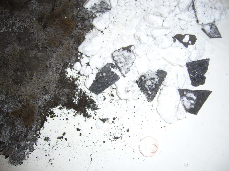 Roofing building materials often contain supporting textures. Are these organics fibres - like in the example here – so the bitumen and the fibre are present as a blend after the comminution. With small weighted samples, possibly the homogeneity of the sample is not sufficient. Two solutions are suitable here: Both parts are analysed separately and then combined mathematically. Or the fibres are severed off, again mixed with dry ice and with the aid of a finer sieve, additionally comminuted. Then from both phases a homogenous average sample can be obtained.